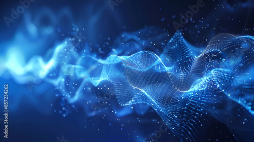 3d rendering of glowing particles in empty space. Futuristic blue background with depth of field and bokeh ,Digital particles wave flow with bokeh abstract background
