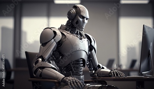 3d rendering of humanoid robot android technology background abstract in office city view. Futuristic cyborg learning laptop computer sitting at desk, Generative Ai.