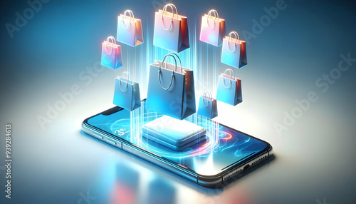 3D Smartphone with Holographic Shopping Bags concept as Horizontal shot of a smartphone placed on a white surface with glowing holographic shopping bags floating above it creating a futuristic Black F