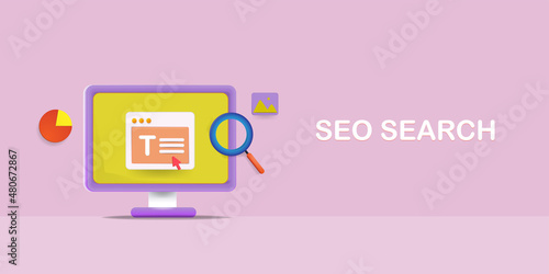 3d style concept of search engine optimization, web page on computer screen, magnifying glass with seo text abstract violet background.