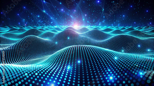 3D Wave Landscape: Data Technology Background with Dots and Binary Code - Big Data, Science, and Digital Processing