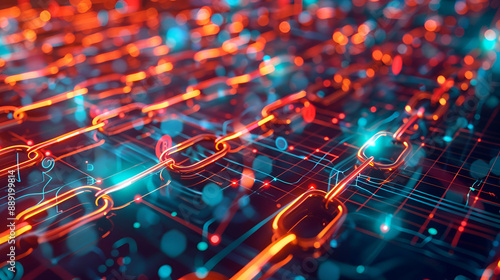 3d wireframe model of a chain with random numbers, abstract tech background, concept of blockchain,3D illustration of a chain of links on a dark background