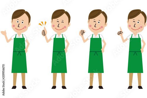ポップな緑のエプロンをした男性が4ポーズ