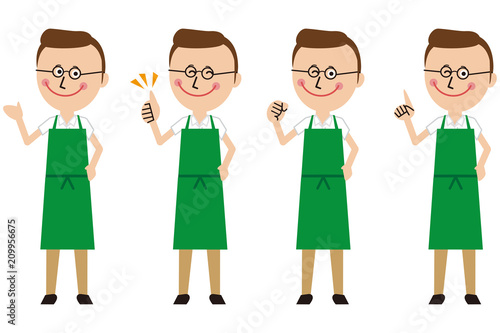 ポップな緑のエプロンをした眼鏡の男性が4ポーズ