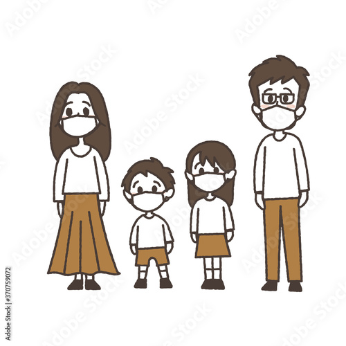 マスクをして立っている4人家族のイラスト