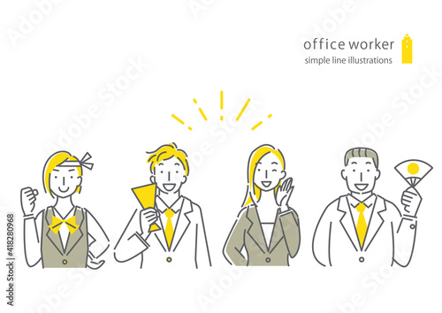 4人のビジネスパーソンのシンプルでスタイリッシュな線画イラストセット 若い男女 中年男性 応援