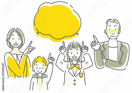 笑顔で上を指差す4人家族 吹き出し付き シンプルでお洒落な線画イラスト