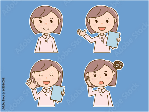 カルテを持って説明する_挨拶する_悩む看護師さん_ピンク白衣女性の4ポーズセット_白フチあり