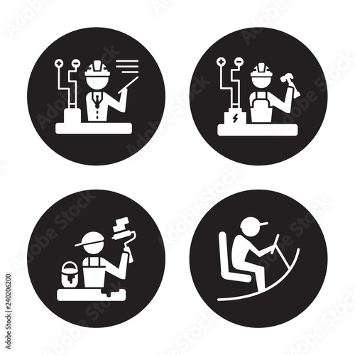 4 vector icon set : Engineer, Dyer, Electrician, Driver isolated on black background