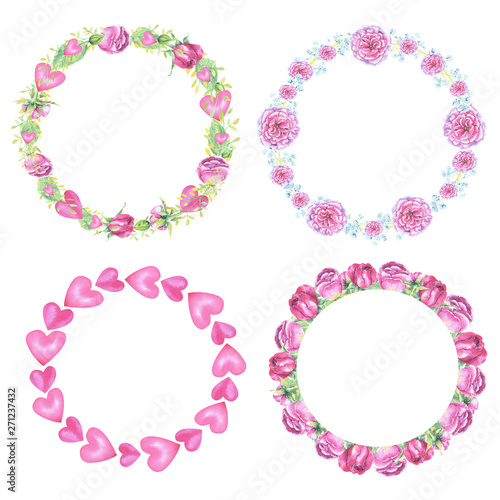 4 wreaths with pink roses, peony and floral elements, heart on a white background .Hand painted in watercolor.