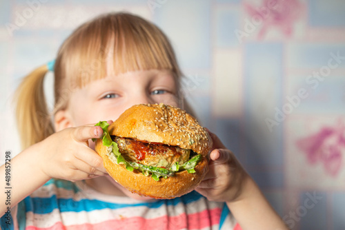4 year old caucasian girl eating a big hamburger cooked at home. Copy space for text
