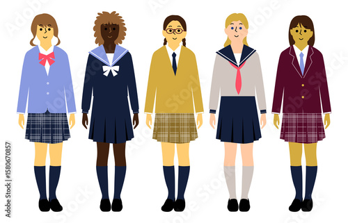 いろんな国の女子学生たち制服正面全身アイコンセット5人