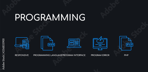 5 outline stroke blue php, program error, program interface, programming language, responsive icons from programming collection on black background. line editable linear thin icons.