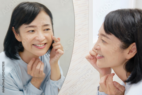 鏡を見て顔のスキンケアをする50代の女性