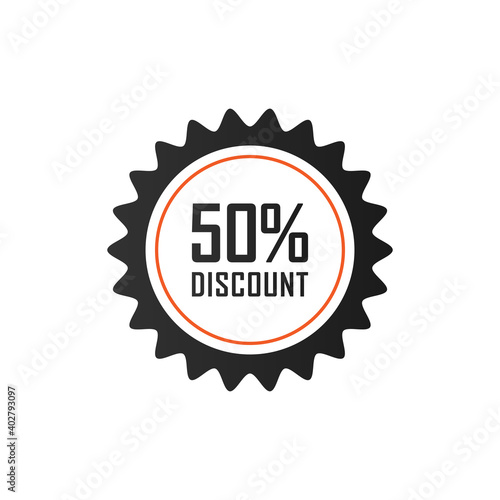 50 Percent Sticker Label. Black Text with Starburst Banner isolated on White Background. Usable for Promotion, Advertising and More Graphic Resources. Flat Vector Design Template Element.