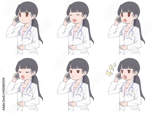 スマホで電話をかける黒髪の女性医師・様々な表情6種類セット