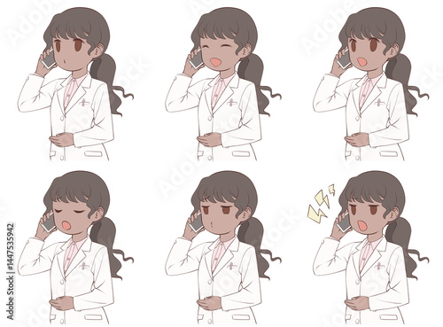 スマホで電話をかける褐色肌の女性薬剤師。様々な表情6種類セット