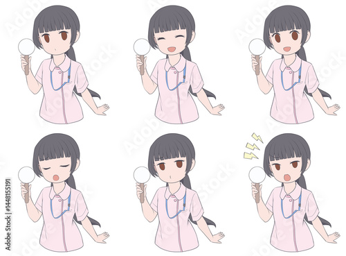 無地のプラカードを持つ黒髪の女性看護師。6種類の表情セット