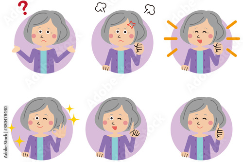 ポップなシニアの女性 背景マル 6ポーズセット