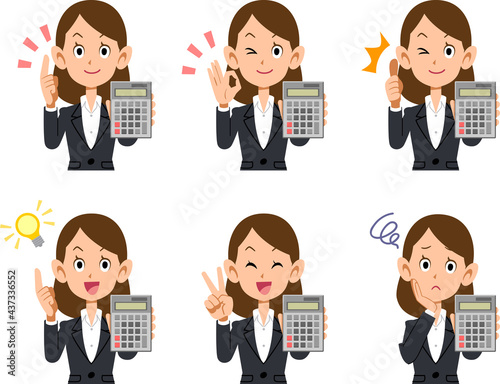 計算機を持つスーツ姿の女性の表情と仕草のイラスト6点セット
