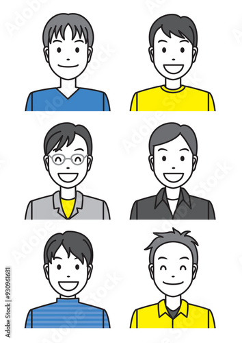 笑顔の若い男性の上半身6点セット-青と黄色