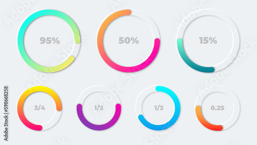 7 Editable gradient Neumorphism circular progress bars. Vector Graphic Templates.