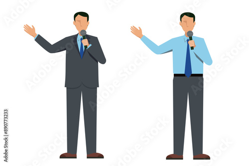 8頭身のフラットデザイン マイクを持ちプレゼンテーションする日本人男性ビジネスマン イラストセット