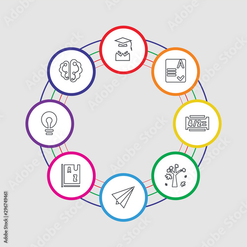 8 colorful stroke icons set included brain, light bulb, dictionary, paper plane, autumn, chalkboard, exam, exam