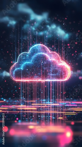 95. A glowing cloud with neon digital lines streaming through it, symbolizing cloud-based hosting