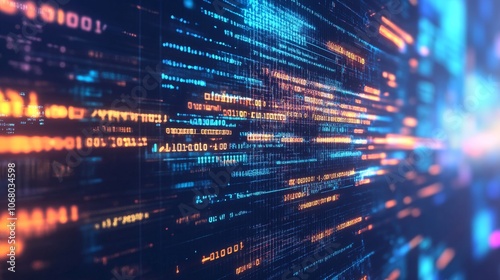 9.A web of glowing code lines, projected in 3D, stretches across a digital matrix background. The abstract design features programming scripts surrounded by holographic tech elements, hinting at