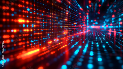 A 3D Abstract Digital Grid with Red and Blue Lights Creates a Glowing Corridor Effect