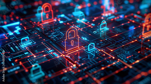 A 3D animated scene featuring intricate digital locks and encrypted codes to signify high-tech security measures