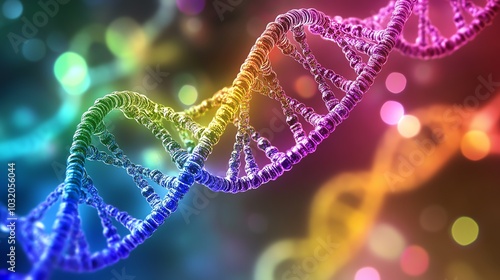 A 3D model of a DNA double helix with a rainbow color scheme.