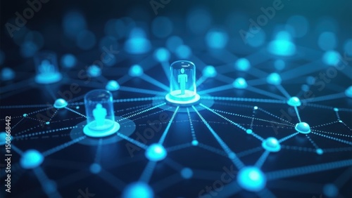 A 3D networking with interconnected dots forming a web, glowing blue nodes, symbolizing professional connections .