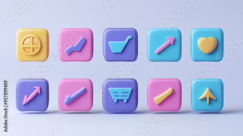 A 3D render featuring a set of "Click Here" web buttons designed for online shopping and UI/UX applications. The scene includes various action buttons, such as "Add to Cart" and "Shop Now," each rende