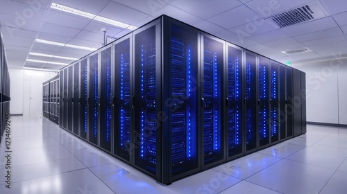 A 3D render of a modern data center with blue-lit server racks, showcasing advanced technology and clean infrastructure. Perfect for tech and cloud computing visuals