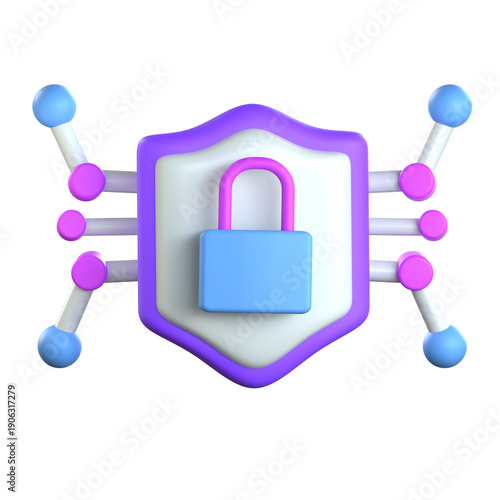 A 3D rendered security shield with a central padlock and node connections representing a secure network infrastructure