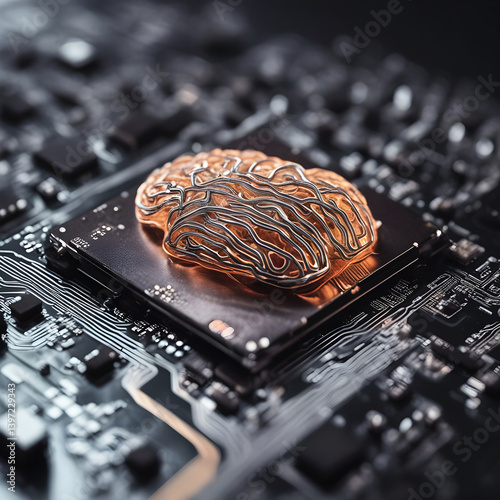 A 3D rendering of a computer chip specifically a microprocessor with a brain-like structure on top.