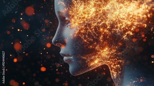 A 3D rendering of a digital avatar with veins of light that are splintering into digital particles, highly detailed