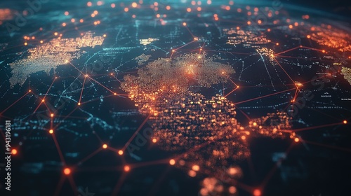 A 3D rendering of a global communication network, with interconnected lines and points.
