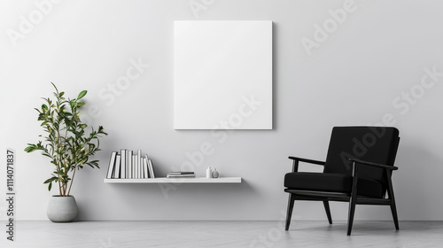 "A 3D rendering of a modern living room featuring a black armchair, an open shelf with decor and books, and a coffee table. The wall is gray, with an empty white frame for art, perfect for a canvas mo