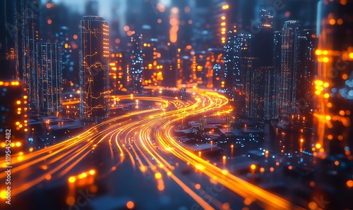 A 3D rendering of a smart city surrounded by flowing, glowing light trails