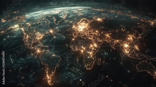 A 3D representation of the world with illuminated lines connecting business hubs and human resources working across continents.