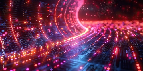A 3D-rendered digital matrix with binary code flowing through the background.