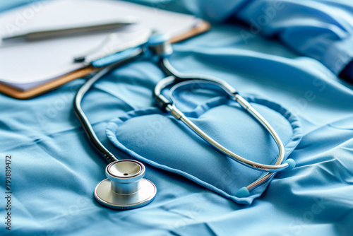 A a blue scrubs with a heart