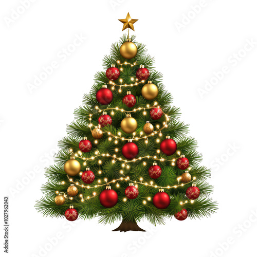 A beautifully decorated Christmas tree with ornaments and lights, symbolizing festive spirit. isolated on transparent background.