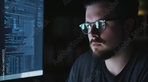 A bespectacled developer, reflecting on digital technology and cyber security, is programming software, with a close-up view of code data.