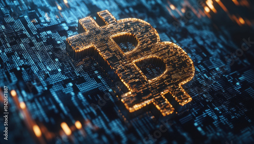 A Bitcoin symbol glows brightly on a textured digital surface, representing the intersection of cryptocurrency and advanced technology. The lighting emphasizes intricate patterns and designs.