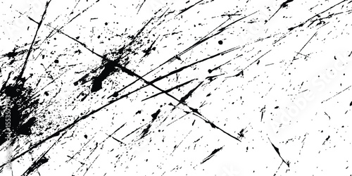A black and white background with black lines and splatters isolated on white background. Abstract black scratch marks line on a white background. Intricate designs of lines and dots in various sizes,