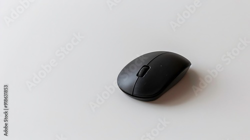 A black computer mouse on a white surface.